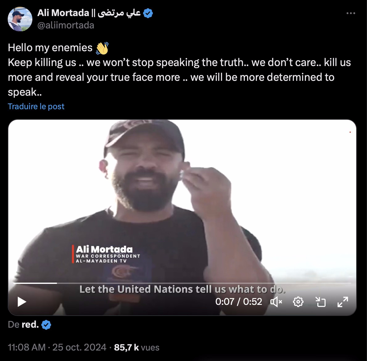 Ali Shoeib, le célèbre correspondant d'Al Manar au Sud-Liban, a publié un message vidéo disant :