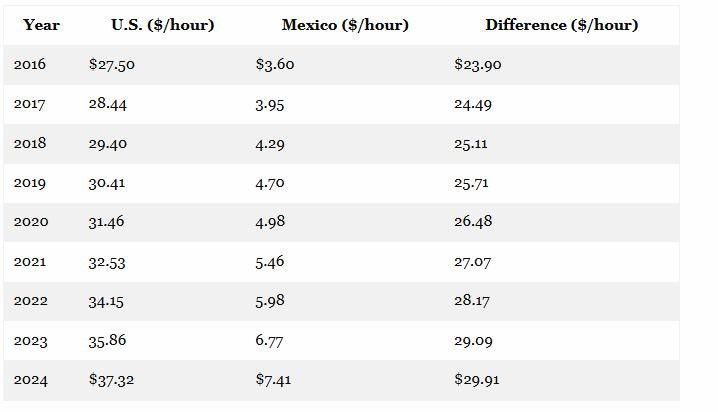 As shown in the table below, in fact, average hourly US manufacturing wages including payroll taxes, health care, pension funding and other fringes rose from $27.50 per hour in 2016 to $37.32 per hour in 2024. In turn, the wage gap with far lower hourly pay levels in Mexico increased from $23.90 in 2016 t0 $29.91.