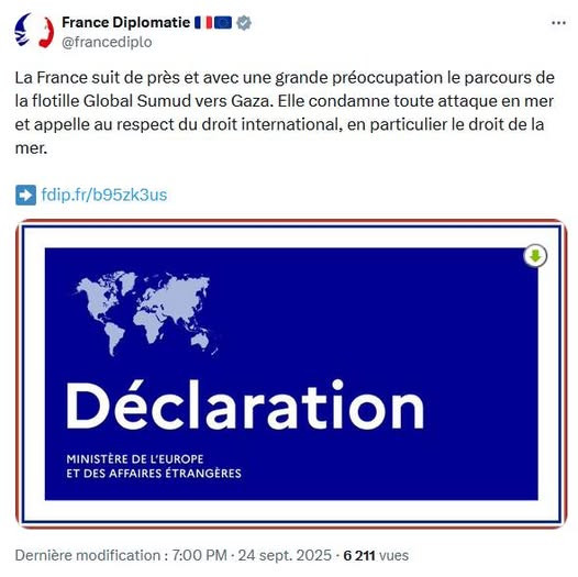 Le ministère français des Affaires étrangères a publié mercredi soir un communiqué de pacotille sur la Flottille et les dangers qui menacent celle. Pacotille, parce qu'aucun engagement n'est pris concernant la défense des citoyens de nationalité française à bord des navires. Et, à la différence de l'Italie et de l'Espagne, Paris se garde d'annoncer l'envoi en Méditerranée de moyens de protection, face à la piraterie du régime génocidaire israélien.
