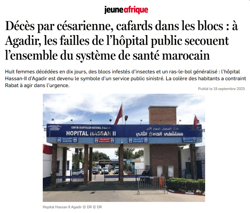 Cette crise structurelle a conduit les citoyens à manifester dans plusieurs villes, dont Agadir, pour réclamer de meilleurs services de santé et un meilleur accès aux soins de base sous la bannière « Mettre fin à la négligence des soins de santé ». À Agadir, après que plusieurs femmes ont perdu la vie lors d'interventions chirurgicales par césarienne à l'hôpital Hassan II, des citoyens et des membres de la société civile ont organisé des manifestations devant l'hôpital, exigeant des investigations rapides et des améliorations tangibles dans les cliniques, les services d'urgence et les équipements.