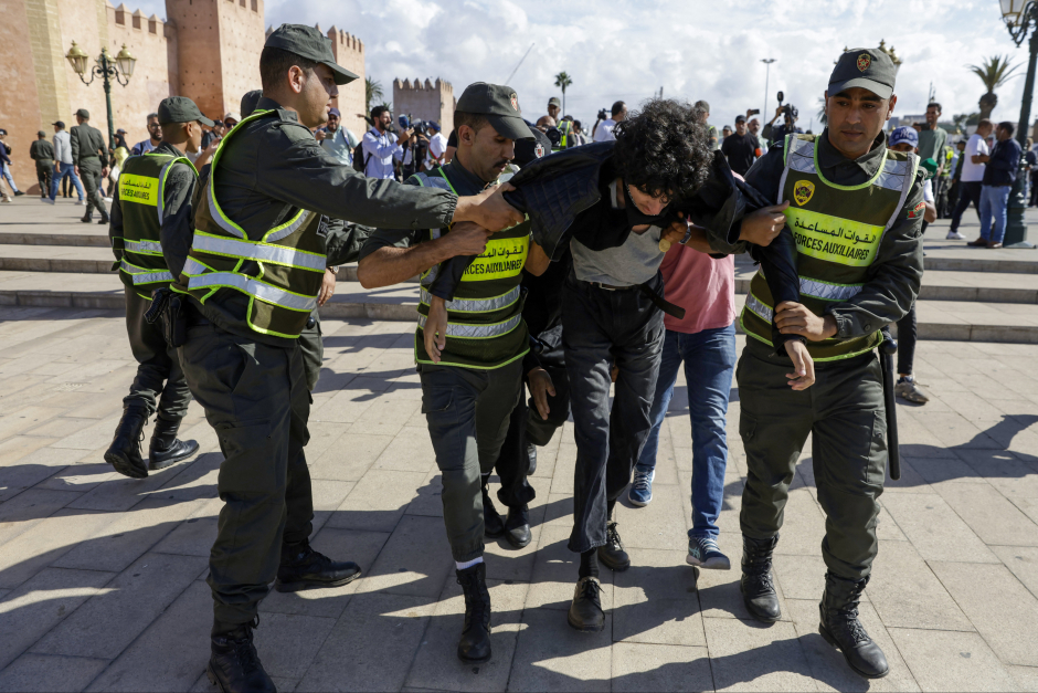Les forces de sécurité marocaines arrêtent un manifestant à Rabat, le 28 septembre 2025 (AFP)