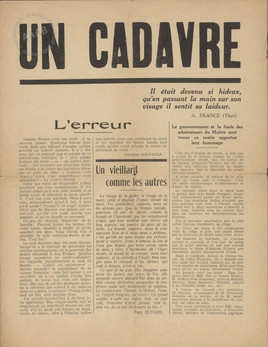 Imaginé par André Robert Breton (1896–1966), Paul Éluard (1895–1952) et Louis Aragon (1897–1982), l'article incriminé était un pamphlet de quatre pages intitulé Un Cadavre et visait à noircir le nom du poète, romancier et dramaturge socialiste en réaction au fait que ses œuvres littéraires étaient dévorées en si grand nombre. Bien que France ait été universellement vénéré, Breton expliqua que lui et ses compagnons conspirateurs