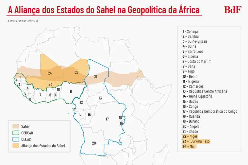 La vague de soulèvements militaires progressistes a commencé au Mali, en août 2020, lorsque Assimi Goïta a renversé le président Ibrahim Boubacar Keïta, au milieu de protestations massives contre la présence française dans le pays. En 2022, au Burkina Faso, le capitaine Ibrahim Traoré a mené un soulèvement qui a déposé le leader militaire Paul-Henri Damiba. Et fermant la liste se trouve le Niger, en 2023, avec l'ascension du général Abdourahamane «Omar» Tchiani au pouvoir.