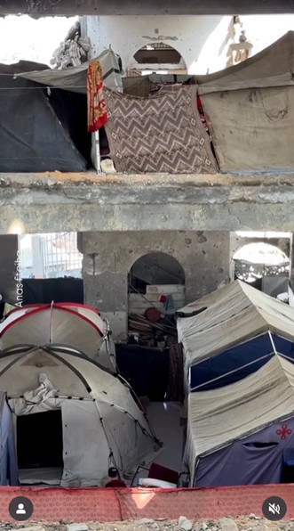 La mosquée Al-Shafi'i dans le quartier Al-Zaytoun à Gaza est devenue un abri pour les familles déplacées dans l'est de Gaza, après qu'elles soient retournées pour trouver leurs maisons réduites en décombres et inhabitable. Plus de 1.200 mosquées à travers la bande de Gaza ont été détruites par Israël. Par @anas.fteiha. Capture d'écran de la VIDEO de Eyes on Palestine, sur Instagram, le 23 octobre 2025.