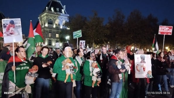 Arrivés à notre point de rassemblement sur la place Beaubourg, nos prises de paroles ont permis, d'analyser la situation à Gaza, en Cisjordanie et à Jérusalem, et d'appeler au boycott de tous les produits israéliens et des firmes complices du génocide.