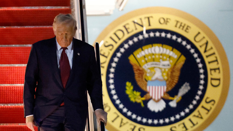 Donald Trump descend d'Air Force One à son arrivée à la base militaire de Joint Base Andrews, le 5 novembre 2025, après avoir prononcé un discours à l'American Business Forum à Miami.