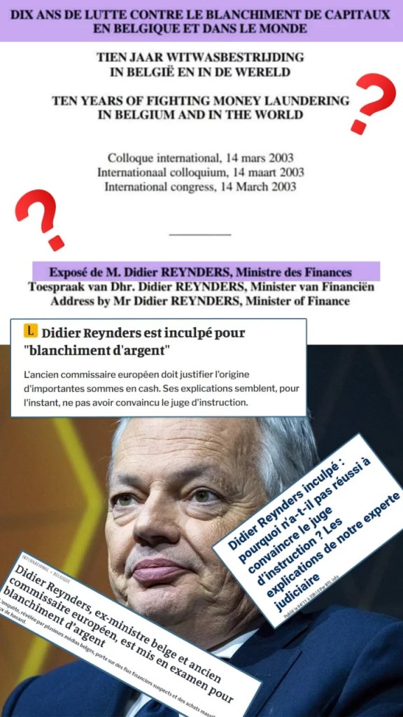 Didier Reynders, orateur principal comme ministre des Finances, en 2003 à un colloque « Dix ans de lutte contre le blanchiment de capitaux en Belgique et dans le monde », pris la main dans le sac aujourd'hui. On comprend pourquoi, avant d'intégrer sa fonction de commissaire européen à la justice (sic!), il fit une proposition de loi pour punir les lanceurs d'alerte à plusieurs mois de prison et 5.000€ d'amende(note)... Didi voulait anticiper et mettre en place les structures pour le protéger. C'est ce qu'il fit toute sa carrière...