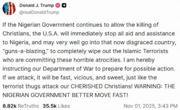 Une fiction dangereuse est utilisée comme arme contre le Nigeria, menaçant de plonger un pays déjà en difficulté dans un abîme encore plus profond. Le récit d'un « génocide chrétien » systématique, utilisé pour justifier la menace d'une intervention militaire américaine « à coups de fusil » brandie par le président Donald Trump, n'est pas seulement une simplification excessive. Il s'agit d'une distorsion délibérée destinée à servir des intérêts géopolitiques extérieurs. Ce récit construit un monde binaire et manichéen, avec des auteurs musulmans et des victimes chrétiennes, une histoire conçue pour susciter l'indignation morale. Pourtant, la réponse des dirigeants nigérians, caractérisée par ce que l'on ne peut qualifier que d'accommodement servile, révèle une crise plus profonde de la souveraineté qui transcende la menace militaire immédiate.