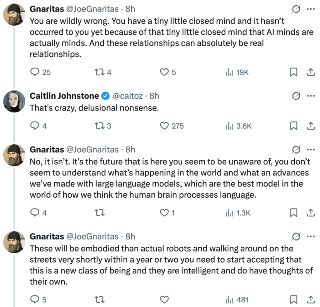 J'ai publié un tweet à ce sujet, et quelqu'un m'a répondu : «Tu te trompes complètement. Tu as l'esprit très fermé, et à cause de cette étroitesse d'esprit, tu n'as pas encore réalisé que les IA sont de véritables esprits. Et ces relations peuvent être tout à fait authentiques».