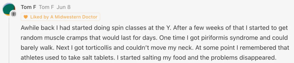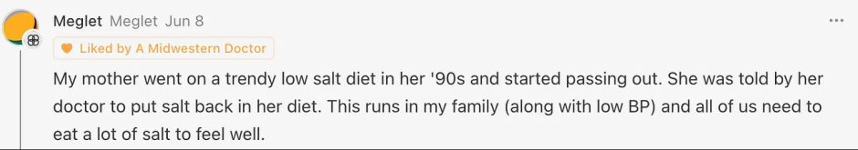 Despite this, patients are often pushed to eliminate all (or almost all) salt from their life. Beyond this significantly reducing their quality of life (as people like salty foods) it can be dangerous. For example:
