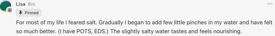 • Many have reported discovering low salt consumption was the cause of their fatigue and lightheadedness (which has also been proven in a clinical trial which treated postural orthostatic tachycardia syndrome with increasing dietary sodium).