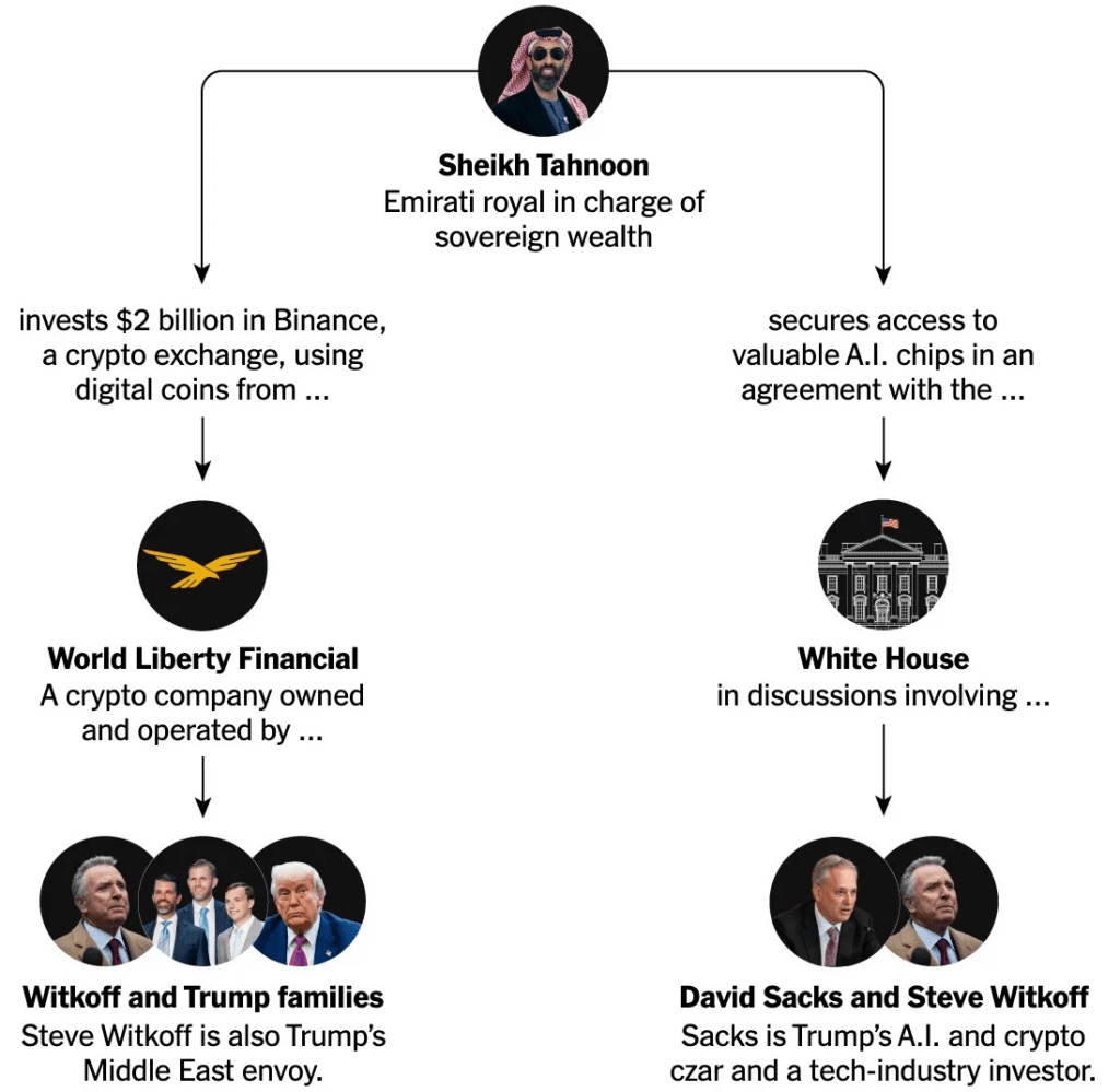 Dans ce qui était clairement une mesure visant à rendre l'accord plus attrayant, quelques semaines seulement avant la conclusion de l'accord entre Trump et les Émirats arabes unis, Steve Witkoff, l'envoyé spécial de Trump au Moyen-Orient, a rencontré le cheikh Tahnoon ben Zayed Al Nahyan en Sardaigne. Le cheikh Tahnoon est le frère de l'émir d'Abu Dhabi, conseiller à la Sécurité nationale des Émirats arabes unis et PDG de MGX (Mubadala). Le cheikh Tahnoon a accepté d' investir 2 milliards de dollars dans World Liberty Financial, une entreprise de cryptomonnaie détenue par les familles Witkoff et Trump.