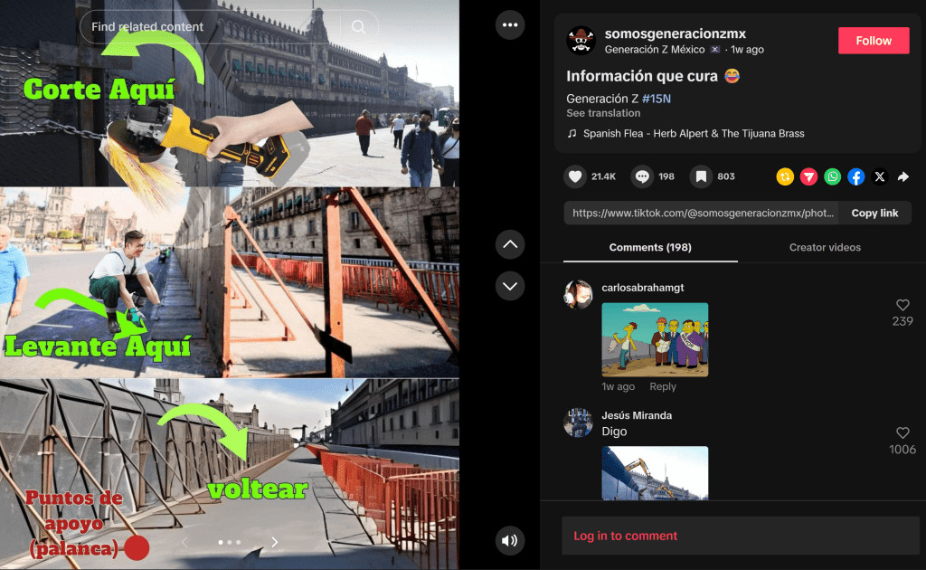 In the days leading up to the violence in Mexico, the We Are Generation Z Mexico page published a series of contradictory messages, with one Nov. 12  post insisting protesters not "vandalize" or "destroy," hours before another  post was made by the same account showing followers how to use angle grinders and physical force to disassemble the metal barricades installed to keep demonstrators from reaching the presidential palace.