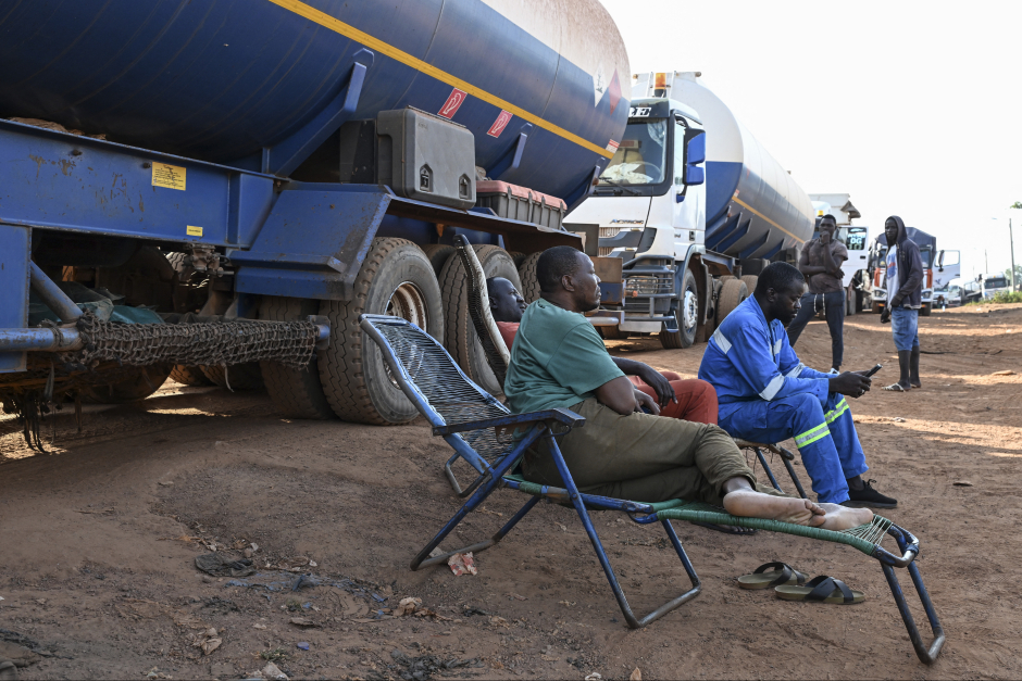 Les conducteurs de camions-citernes maliens sont assis sur des chaises en attendant de franchir la frontière entre la Côte d'Ivoire et le Mali (AFP)