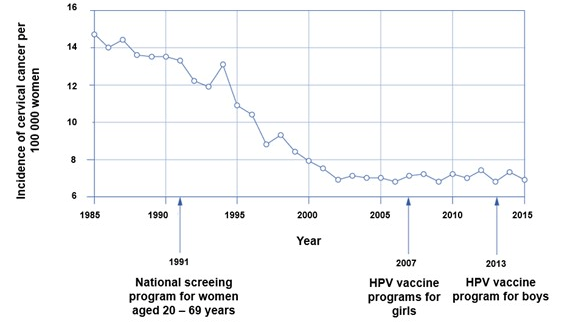 En Australie, Le dépistage cytologique institué en 1991 a été suivi d'une baisse d'incidence de près de 50% (de 13 en 1991 à 7 en 2006).