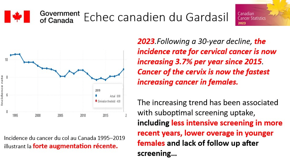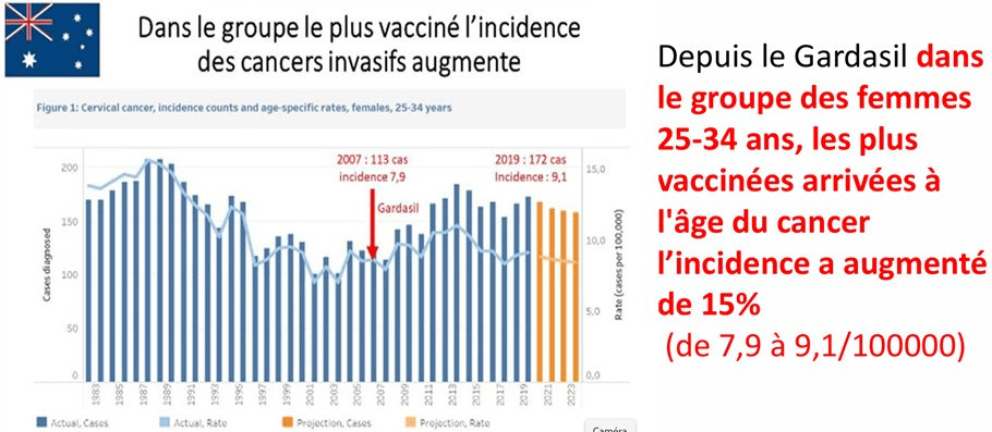 En 2024 l'agence nationale australienne a estimé le nombre de nouveaux cancers du col à 1030 (soit une augmentation de près de 33% du chiffre d'avant la vaccination) et son incidence à 7,1/100000 (22) (soit 15% de plus qu'en France peu vaccinée). Comment peut-on croire à l'éradication prochaine du cancer que promettent constamment les avocats du Gardasil dans tous les médias ? (23)