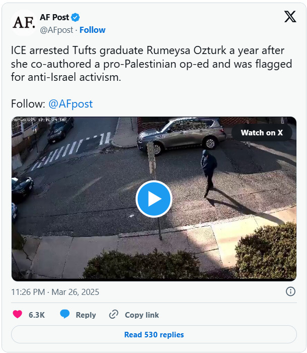 A 30-year-old Tufts doctoral student and Fulbright Scholar from Turkey was walking across her Boston-area neighborhood on the way to a holiday dinner at a friend's house when she was suddenly seized and abducted in the early evening by six masked federal agents of the Department of Homeland Security. The terrified young woman was handcuffed and taken to a waiting car, secretly detained for the next 24 hours without access to friends, family, or lawyers, then shipped off to a holding cell in Louisiana and scheduled for immediate deportation, although a federal judge has now temporarily stayed the proceedings.Just one of the Tweets showing a short clip of that incident has been viewed more than 4.5 million times, with Surveillance shows Tufts graduate student detained accumulating another couple of hundred thousand views.