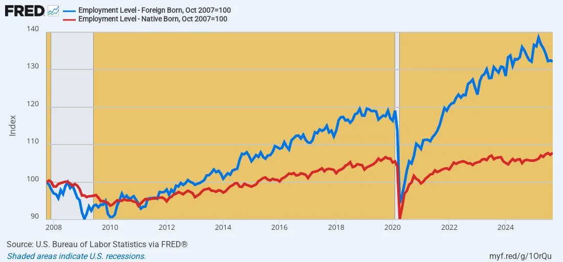 Indeed, when looked at on a longer term basis, the foreign-born source of America's current labor force growth is even more dramatic. Since the pre-crisis peak in Q4 2007 the number of foreign-born workers (blue line) employed in the US has increased by 7.6 million thru September 2025, while the far larger population of native born workers has grown by only 9.2 million (red line).