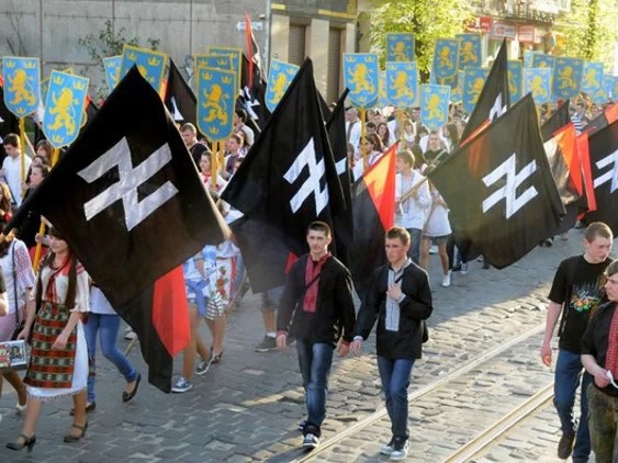 L'Ukraine de Kiev devient le vivier du nazisme renaissant au cœur de l'Europe. À Kiev arrivent des néonazis de toute l'Europe (Italie comprise) et des USA, recrutés surtout par Pravy Sektor et par le bataillon Azov, dont l'empreinte nazie est représentée par l'emblème copié sur celui de la division SS Das Reich. Après avoir été entraînés et mis à l'épreuve dans des actions militaires contre les Russes d'Ukraine dans le Donbas, on les fait rentrer dans leur pays avec le laisser-passer du passeport ukrainien. En même temps est diffusée en Ukraine l'idéologie nazie dans les jeunes générations. S'en occupe notamment le bataillon Azov, qui organise des camps d'entraînement militaire et de formation idéologique pour enfants et adolescents, auxquels on enseigne avant tout à haïr les Russes.