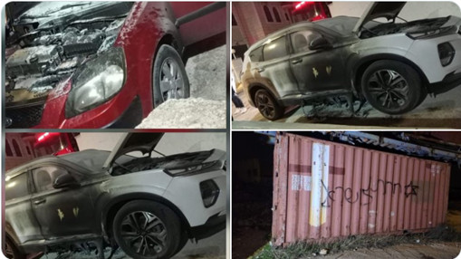 Dans la nuit du 4 au 5 décembre 2025, des milices de colons israéliens ont incendié deux véhicules et tagué des graffitis racistes lors d'une attaque contre le village de Taybeh, à l'est de Ramallah. (Source compte X Wafa.ps)