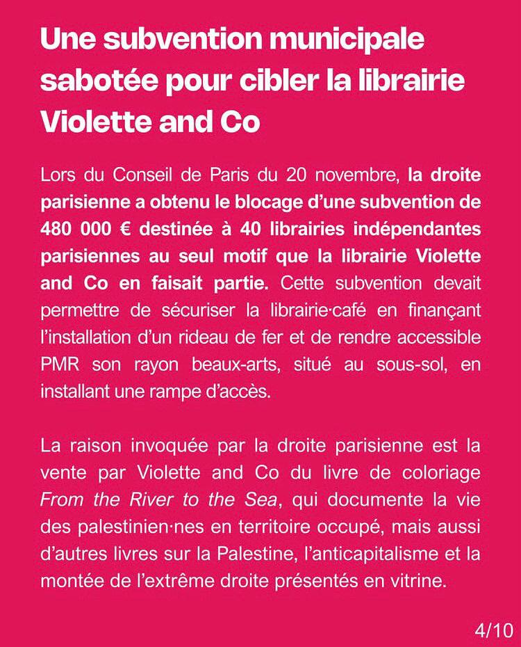 Quelque 40 librairies indépendantes de la région parisienne ont été privées de subventions, à la fois par le Conseil de Paris, et par le Conseil Régional d'Île-de-France pour au moins l'une d'entre elles, après avoir mis en vente des livres sur la Palestine.
