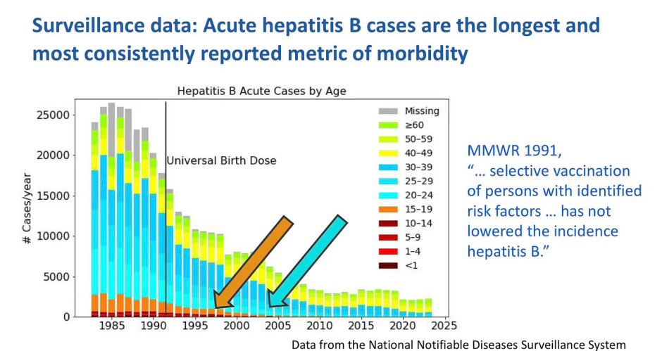 • The benefit attributed to newborn vaccination preventing hepatitis B did not make sense, in part because you have to vaccinate roughly a million children to prevent one case of hepatitis B (and even more to prevent severe complications), and the because decline which had occurred did not match when vaccination had occurred (and was seen in hepatitis C, which was subject to similar control measures as hepatitis B but without a vaccine). Likewise, as ACIP member Retsef Levi highlighted, the "massive" decline in adult hepatitis B cases attributed to newborn vaccination occurred prior to those who had been vaccinated being old enough to be adults.