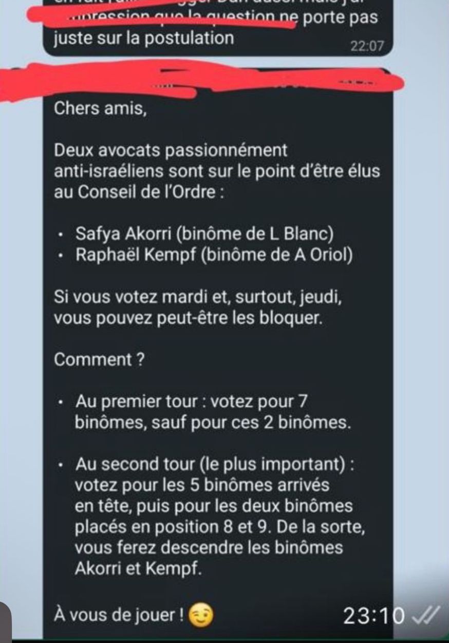 Il envoie un message pour expliquer comment voter de manière à boycotter ces candidats qui ne sont pas pro-Israël, à savoir voter pour tous les autres binômes (les candidats se présentant en binômes femme/homme) afin que les deux binômes concernés recueillent le moins de voix possible.