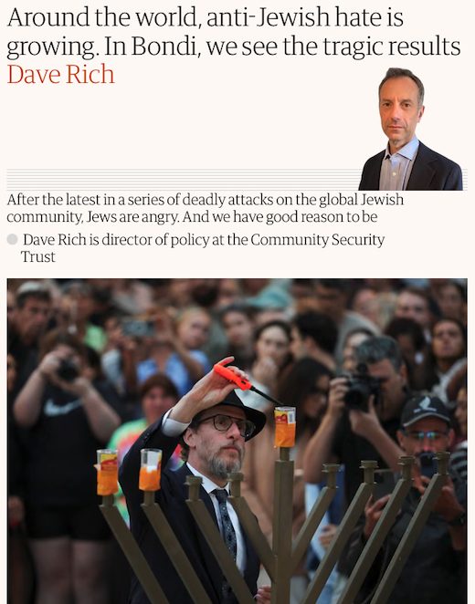 Rich: "This is now a global emergency of antisemitism, and it is the consequence of two years of turning a blind eye, taking the easy path and ignoring the warnings. Make no mistake: alongside the grief and the defiance, Jews are angry. And they have every right to be."