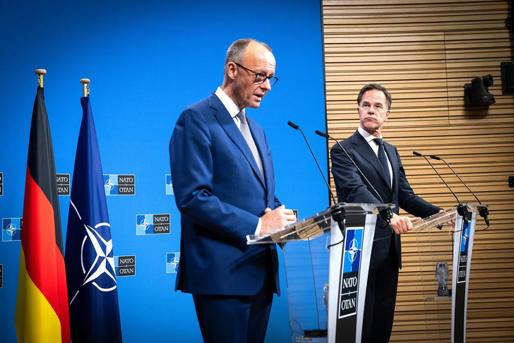 Le chancelier allemand Friedrich Merz et le secrétaire général de l'OTAN Mark Rutte au siège de l'alliance à Bruxelles en mai 2025. (OTAN/Flickr/CC BY-NC-ND 2.0)