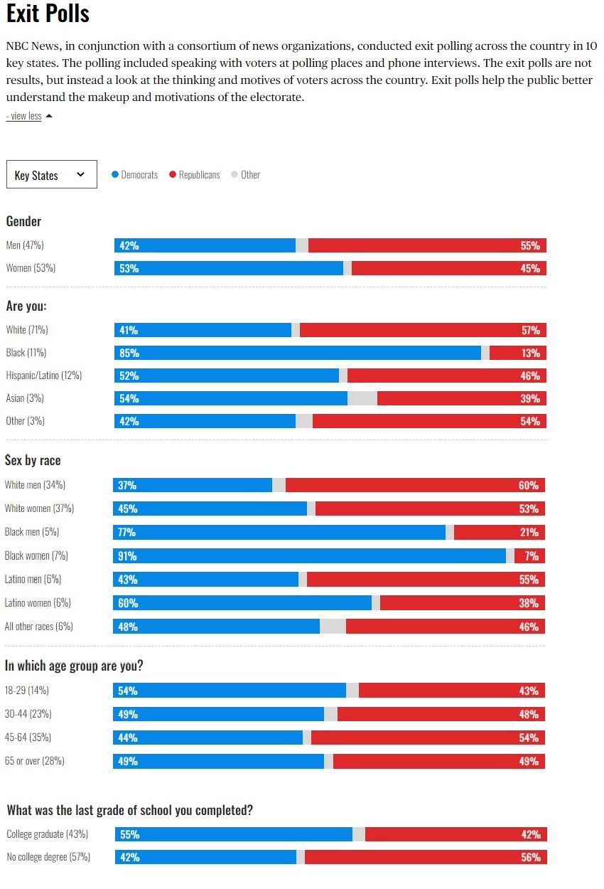 These trends have continued and they even accelerated in last week's remarkable results, in which exit polls revealed that Trump won nearly half the Hispanic vote, the largest share of any Republican candidate in modern American history. Indeed, Trump actually did slightly better with Hispanic men than he did with white women.