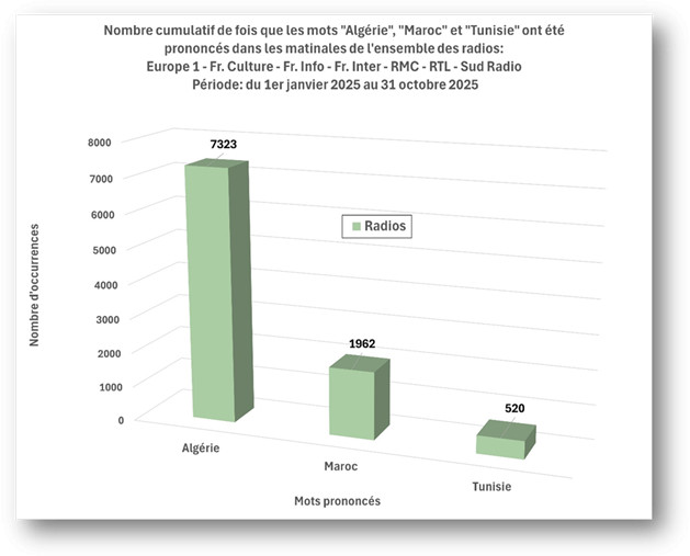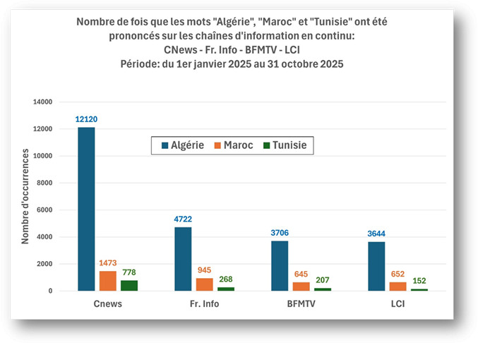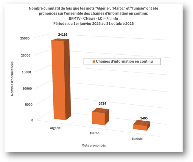 Autre constatation édifiante : puisque l'étude s'étend du 1er janvier au 31 octobre 2025, c'est-à-dire durant 304 jours, le mot « Algérie » a été cité, en moyenne, pas moins de 80 fois par jour par les quatre chaînes d'information en continu ! En comparaison, ces moyennes sont de 12 pour le Maroc et de moins de 5 pour la Tunisie.