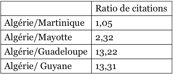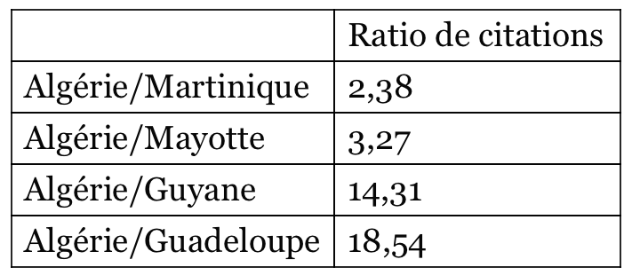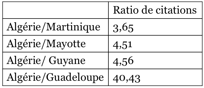 Tableau 4 : Ratio comparatif des citations par CNews entre l'Algérie d'une part et des DROM d'autre part.