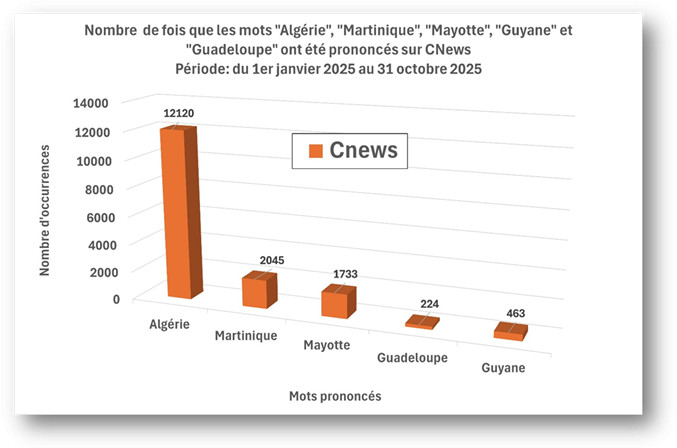 Graphique 7 : Nombre de fois que les mots « Algérie », « Martinique », « Mayotte », « Guyane » et « Guadeloupe » ont été prononcés sur CNews. Période : du 1er janvier 2025 au 31 octobre 2025