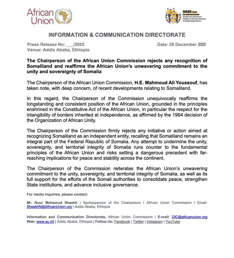 L'Union africaine a rapidement réaffirmé son engagement indéfectible envers l'unité et l'intégrité territoriale de la Somalie. L'Égypte et la Turquie ont condamné la décision d'Israël, la qualifiant d'ingérence illégale. L'Arabie saoudite est allée plus loin, avertissant que la reconnaissance du Somaliland violait le droit international et portait atteinte à la souveraineté de la Somalie. À Mogadiscio, le bureau du Premier ministre somalien a déclaré que le Somaliland était une partie intégrante de l'État somalien.