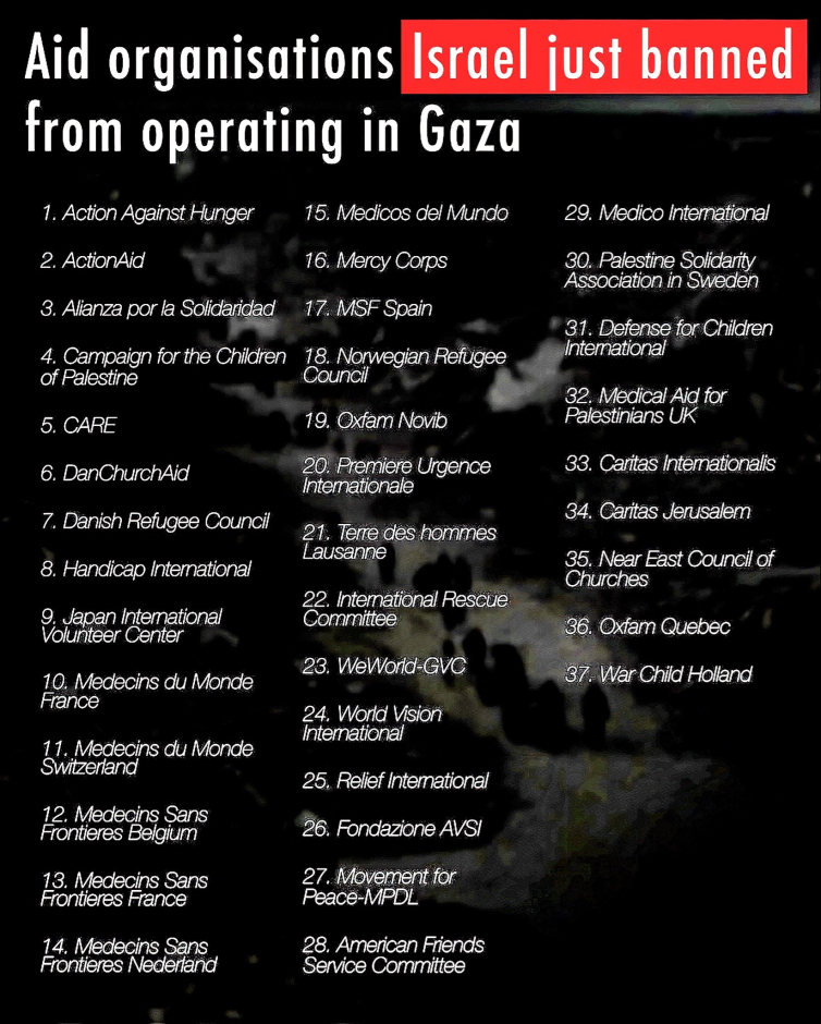 Les 37 ONGs interdites à Gaza par l'Etat génocidaire.