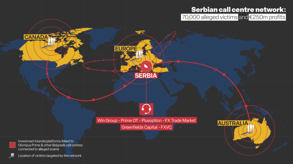 Au total, les quatre centres d'appels de Belgrade ciblaient des individus en Allemagne, en Grande-Bretagne, en Irlande, en Suisse, en Autriche, en Australie et au Canada ; les documents saisis chez Olympus Prime et consultés par IE et BIRN montrent que certains ont perdu quelques centaines d'euros, d'autres plus d'un million.