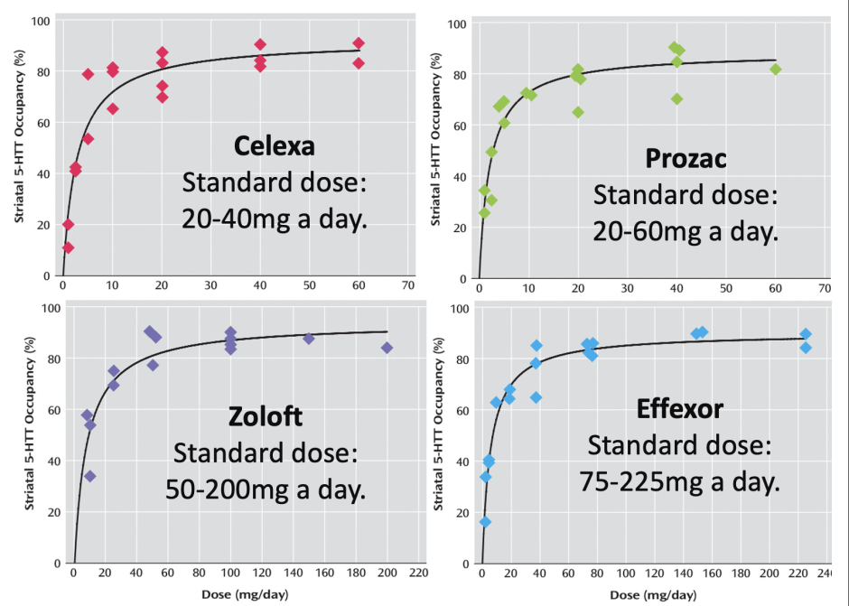 For the roughly 50% of people who experience SSRI withdrawals, one of the most challenging things is how incredibly slowly they have to stop taking them. A major reason for this is due to the non-linear relationship between an SSRI dose and its binding to the brain (e.g., its striatum).