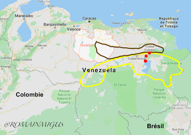 Situation géographique de l'Etat du Guárico (en blanc), de la frange pétrolifère (en marron), de l'Arc minier (en jaune) et des 3 grands barrages hydrauliques (points rouges)