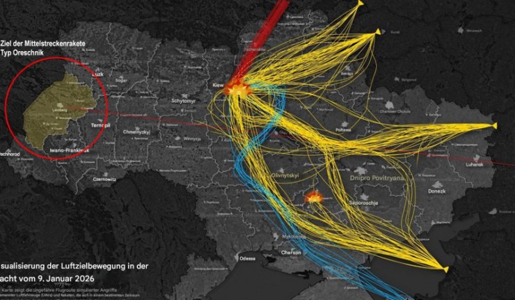 Remarquez la ligne rouge, une seule ligne en direction de Lviv, qui était le lancement d'un ICBM russe «Oreshnik». Cet impact de missile isolé a ensuite déclenché un incendie dans la plus grande installation de stockage souterrain de gaz naturel de toute l'Europe ; dix-sept milliards de mètres cubes de gaz naturel brûlent désormais, de manière incontrôlable, à LVIV.