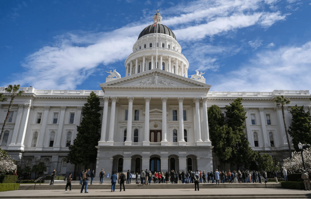 Des personnes se rassemblent devant le Capitole de l'État de Californie à Sacramento, le 10 mars 2023, pour partager leurs expériences de détransition. John Fredricks/The Epoch Times