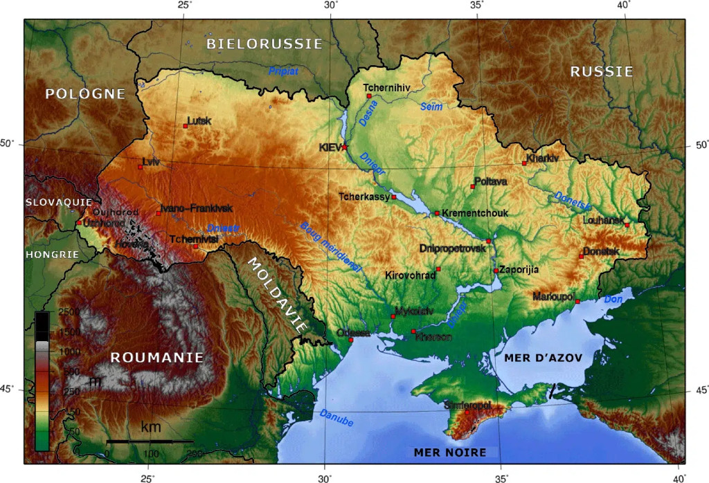 Carte topographique de l'Ukraine en 2022. Auteur : Pline (Wikimedia, licence CC BY-SA 4.0)