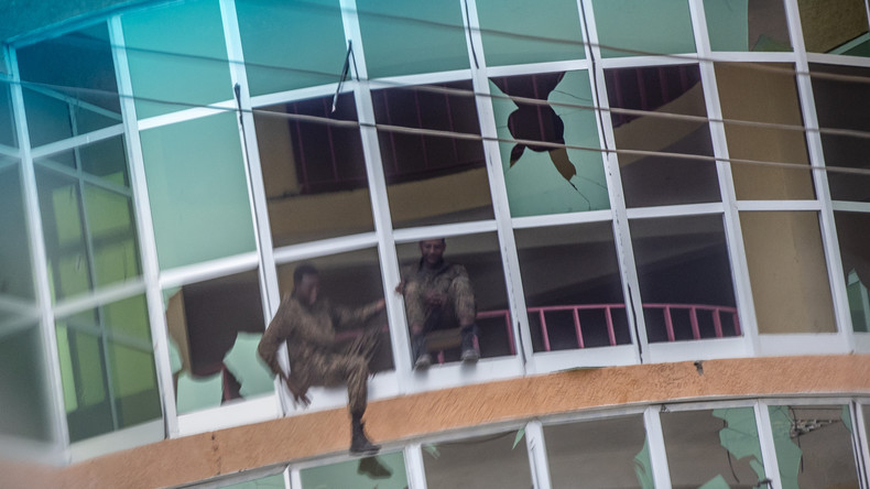 Un soldat éthiopien sort par les fenêtres brisées d'un bâtiment à Abi Adi, dans la région du Tigré, dans le nord de l'Éthiopie, le 11 mai 2021. [Photo d'archives]