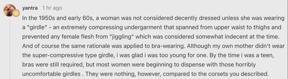 Something most men have difficulty appreciating (let alone empathizing with) is how much pressure society (e.g., in America) places women under to conform to specific appearances that largely exist to fund the fashion industry. The worst of these offenders were the corsets, which to quote Wikipedia were: