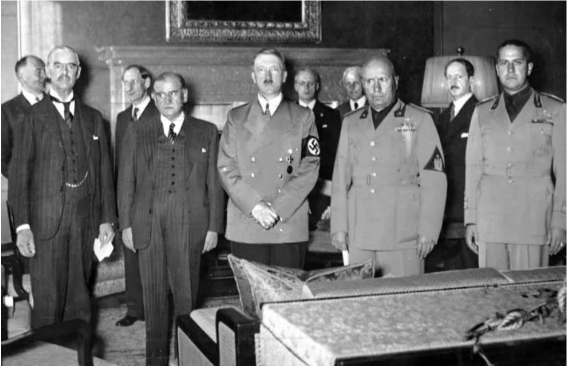 À Munich, en septembre 1938, l'Allemagne nazie, la France, le Royaume-Uni et l'Italie étaient assis autour de la table. La Tchécoslovaquie elle-même n'était pas invitée. Celle-ci dut ensuite accepter qu'une partie de son territoire, les Sudètes, soit cédée, soi-disant pour éviter la guerre avec l'Allemagne.