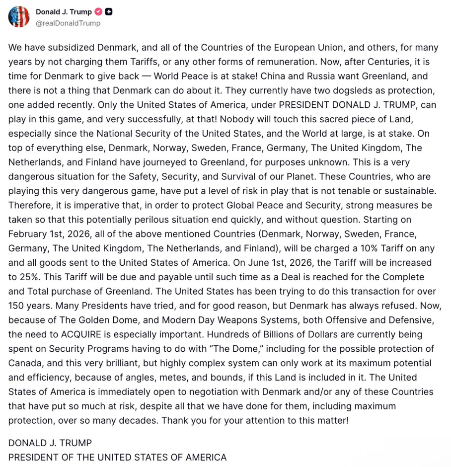 The next thing to happen, while our soldiers were sitting in Greenland for no reason, was that all these efforts to make a statement while not really making a statement to avoid annoying the Americans backfired, in that the Americans got annoyed anyway. U.S. President Donald Trump announced on Truth Social that all participants in this publicity junket would be slapped with punitive 10% tariffs, to be increased by 1 June 2026 to 25% tariffs, "until such time as a Deal is reached for the Complete and Total purchase of Greenland."