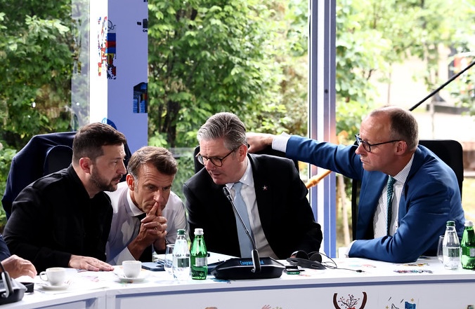 President Zelensky, French President Macron, UK Prime Minister Starmer and German Chancellor Merz speak on the phone with President Trump during a gathering for European officials in gathering in Tirana, Albania, on May 16, 2025. (Simon Dawson / No 10 Downing Street / Flickr / CC BY-NC-ND 2.0)