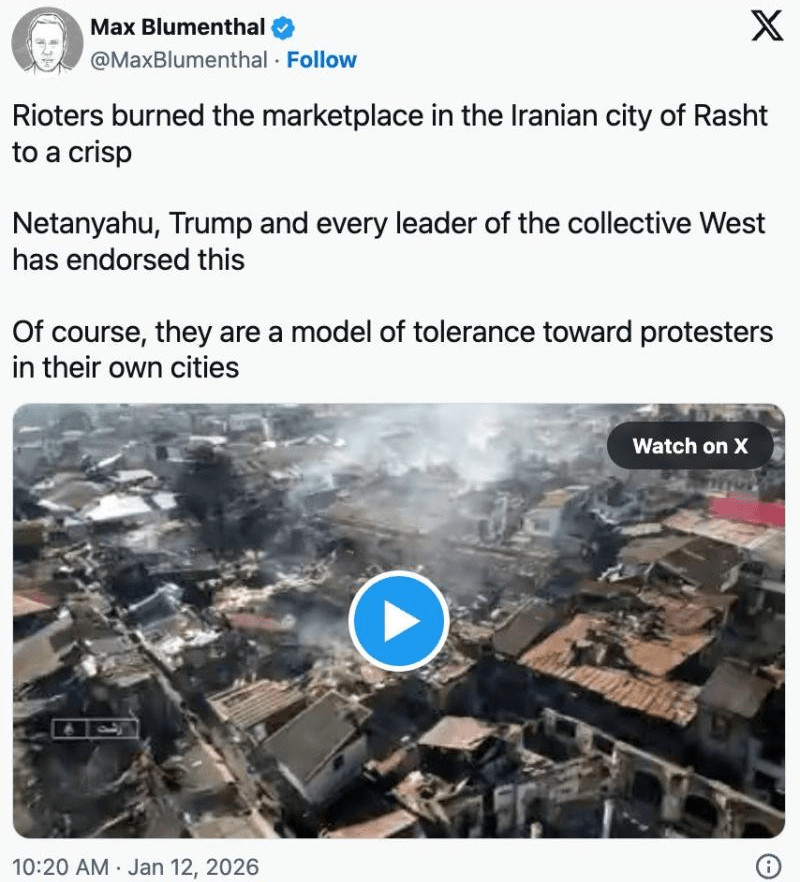 Des groupes violents bien organisés ont rapidement infiltré les manifestations initialement pacifiques début janvier 2026, commettant des meurtres, des incendies criminels et des attaques contre les infrastructures publiques. Les médias occidentaux ont largement ignoré ces actes et ont présenté le mouvement comme étant globalement anti-gouvernemental. L'objectif des émeutiers, à l'instar de celui des États-Unis et d'Israël, était de transformer les manifestations en un soulèvement complet ou en une «révolution», comme l'ont décrit leurs soutiens étrangers.