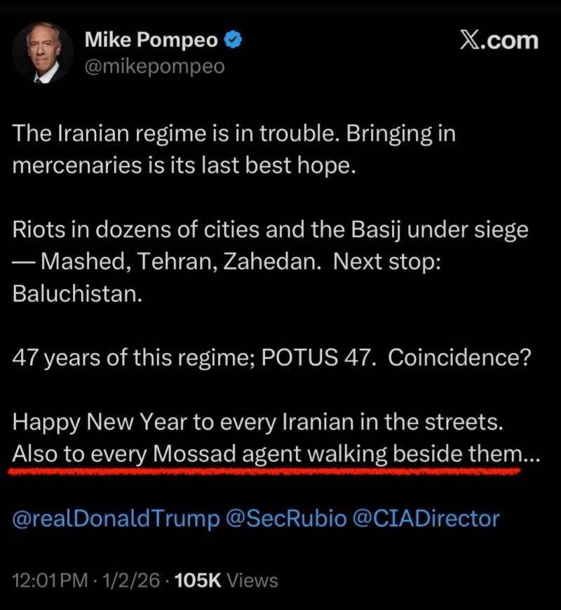 Et l'ancien directeur de la CIA de Trump, Mike Pompeo, un sioniste déclaré, a ouvertement souhaité une «bonne année» à tous les agents du Mossad censés «manifester» en Iran, sans chercher à cacher que le Mossad exploitait activement les manifestations pour faire avancer ses propres intérêts.
