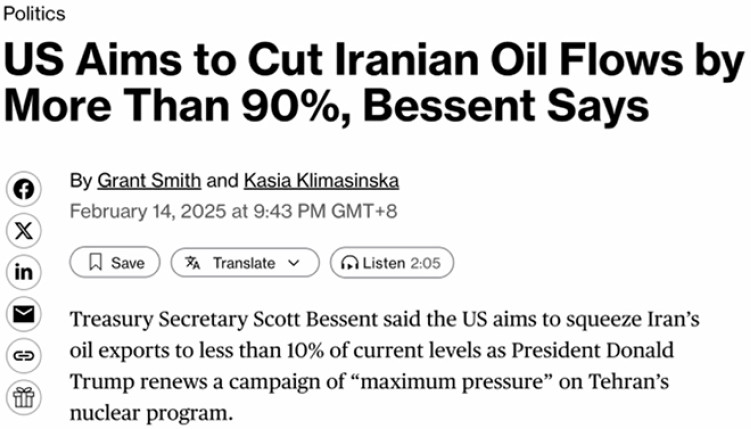 Couper les revenus pétroliers vitaux de l'Iran : provoquer des difficultés économiques afin de déclencher une révolte, tout en redirigeant la colère populaire contre le gouvernement iranien plutôt que contre les puissances étrangères responsables. (Capture d'écran Bloomberg)