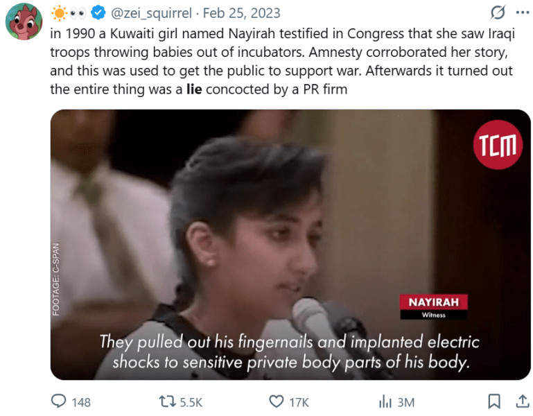Une histoire largement répandue affirmait que des soldats irakiens avaient retiré des bébés des couveuses d'un hôpital. Des enquêtes ont révélé par la suite que le témoin clé avait été coaché par une agence de relations publiques et que l'histoire avait été fabriquée de toutes pièces, mais elle a fortement influencé le soutien à la guerre du Golfe.